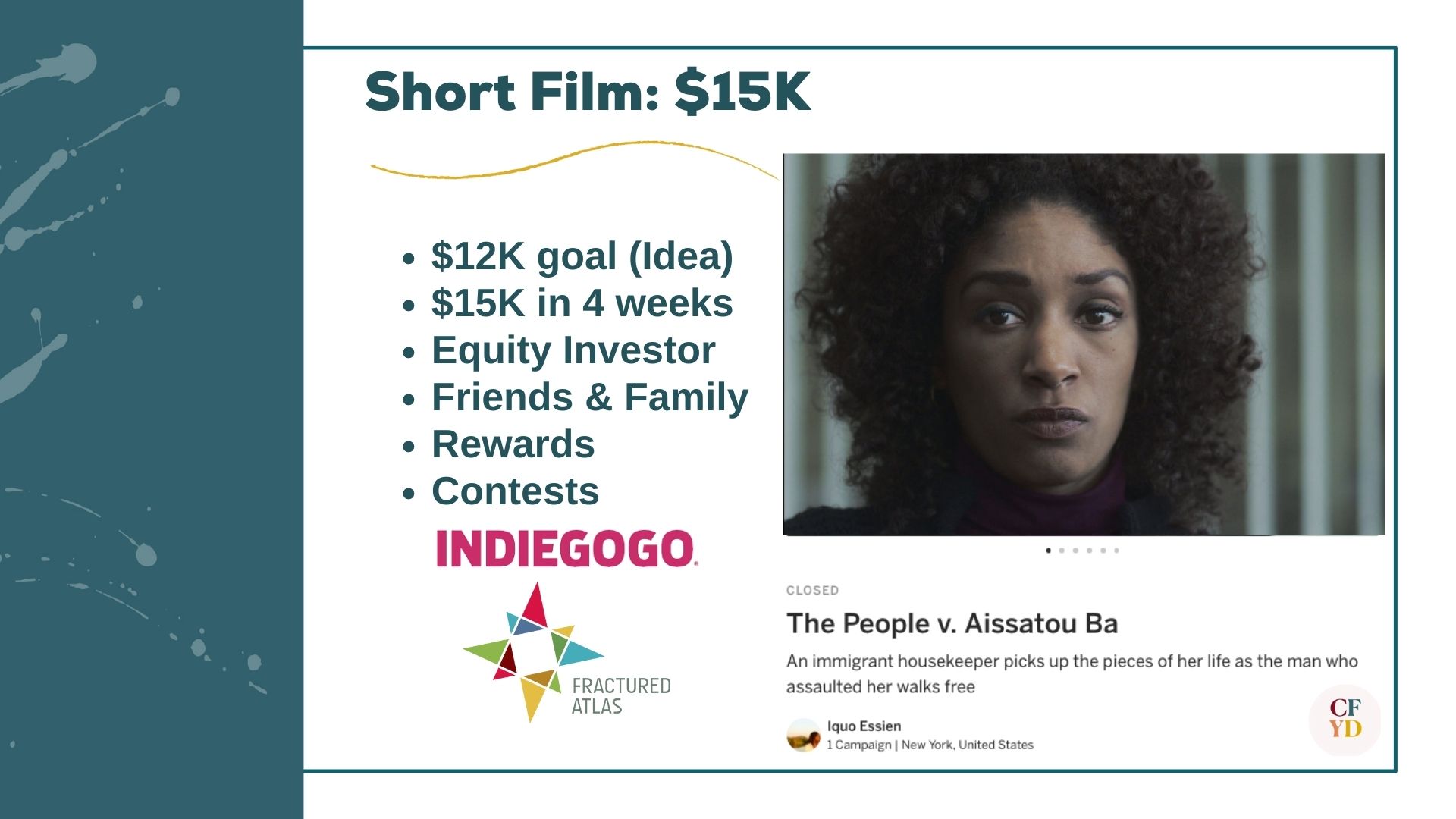 - Fiscal sponsorship. I received fiscal sponsorship through Fractured Atlas, which, at the time, had a partnership with Indiegogo that reduced administration fees and the time to access funds.